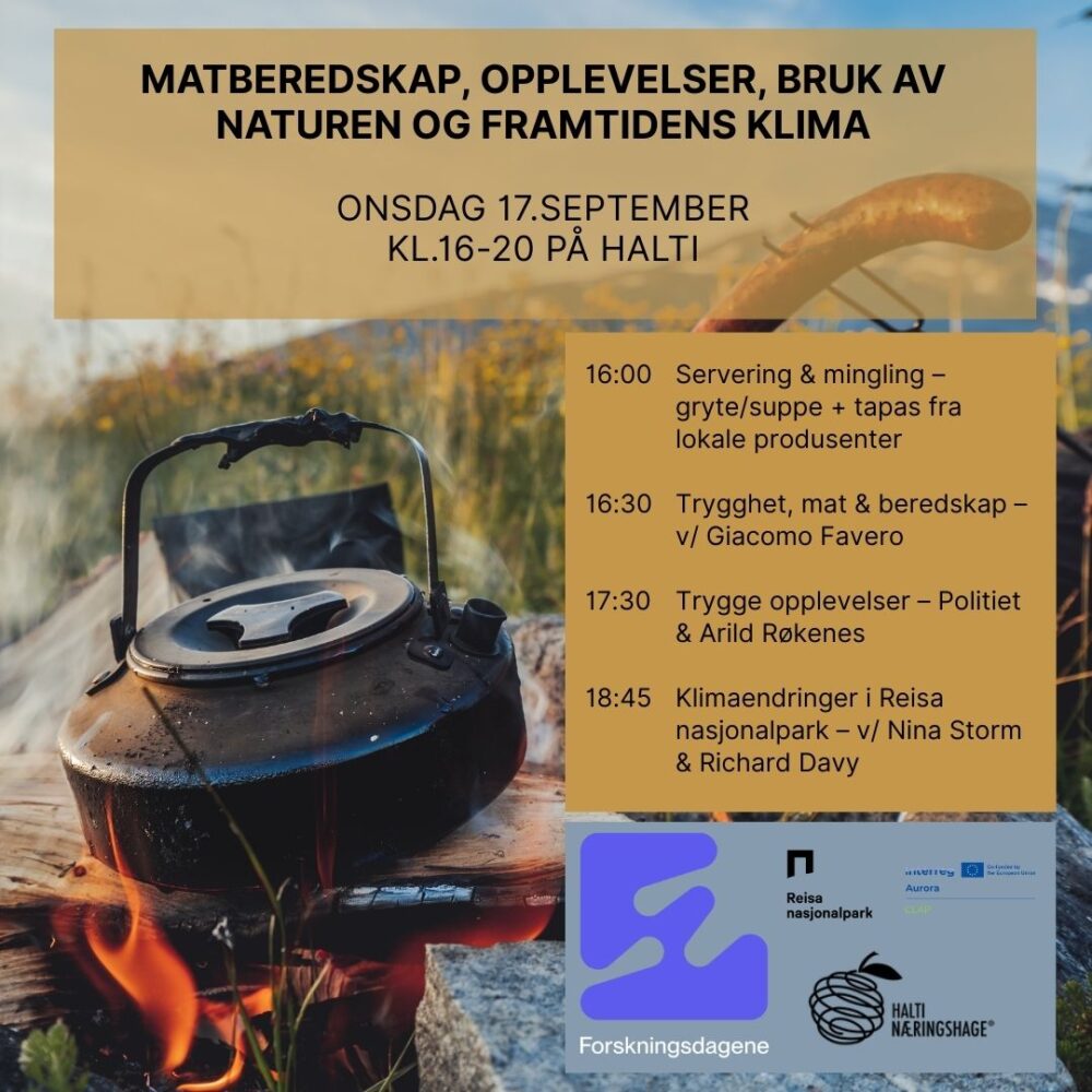 Onsdag 17. september kl. 16:00–20:00 på Halti i Nordreisa kan du lære mer om lokal matberedskap, trygge naturopplevelser og hvordan klimaendringer påvirker Reisa nasjonalpark.